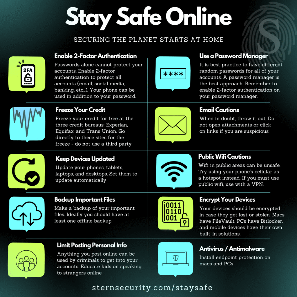 - Be Cautious Online: Protect your personal information online, use strong passwords, and be wary of phishing scams or suspicious emails.